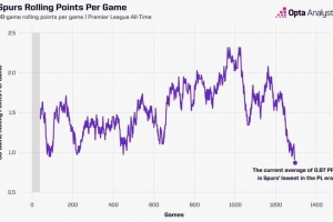 热刺在过去的38场英超比赛中仅积33分。场均0.87分的得分率是该俱乐部整个联赛历史上在连续38场比赛跨度内的最低纪录(按胜场积3分计算),追平了其在1912年和1915年创下的战绩。