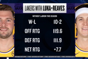 本赛季詹姆斯缺席而东契奇、里夫斯出战时,湖人10胜2负