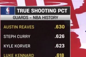 里夫斯生涯真实命中率63% 后卫历史最高 库里62.6%第2 肯纳德第4