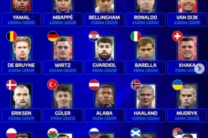 体育资讯3月29日讯 德国转会市场盘点了欧足联旗下各队历史身价最高球员,亚马尔、哈兰德和姆巴佩2亿欧并列榜首,C罗最高1.2亿欧。