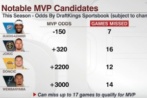 本赛季目前MVP赔率前4(最多缺席17场):